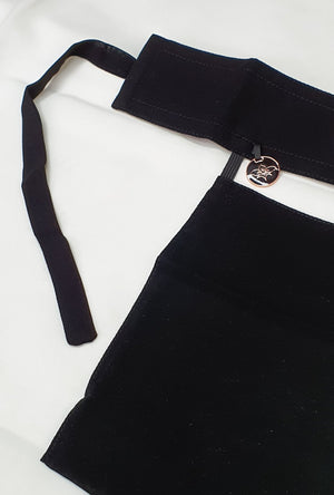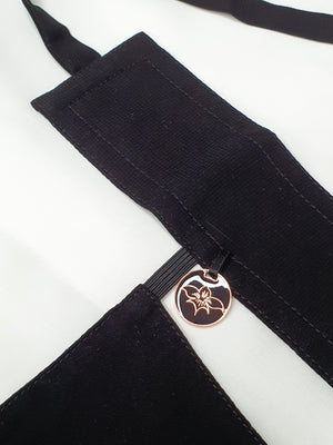 Comfortable short niqab with single long elastic on either side and tie backs.  Adorned with a beautiful round logo.