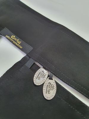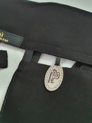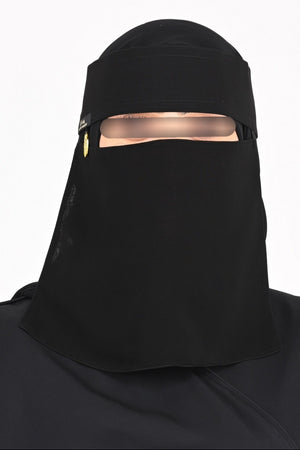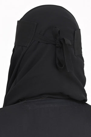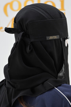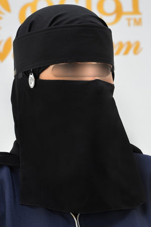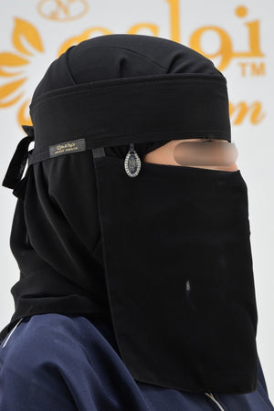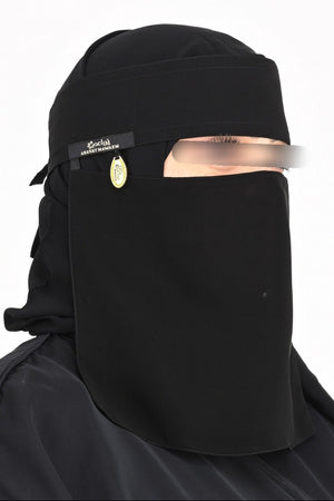 This niqab is a short niqab and has a single elastic on either side and comes complete with a beautiful branded logo in a choice of silver or gold on the side and strings tie backs.
