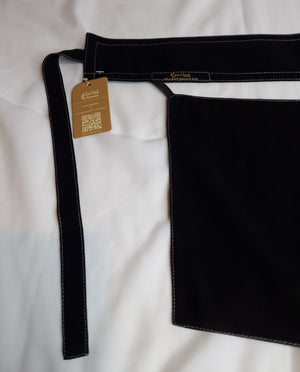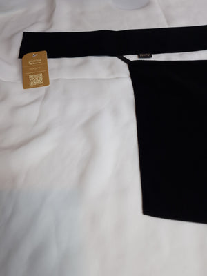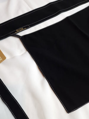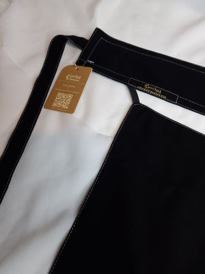 Short Size face veil with slanted elastic sides and white stitch embroidery on the headband and tie backs and edges of the face veil.